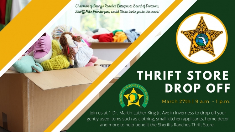 Representatives from the Sheriffs Ranches Thrift Store, located at 3802 S. Suncoast Blvd. in Homosassa (Winn-Dixie shopping plaza), and the Citrus County Sheriff's Office will accept donations from the public and load them up into a thrift store truck, then sell the items at the thrift store to benefit the youth programs of the Florida Sheriffs Youth Ranches