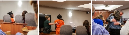Courtroom photos courtesy of SAO: (left and center) Dortch; (right) mother of murder victim, Stanley Haybron embracing assistant state attorney Blake Shore after Dortch's sentencing.