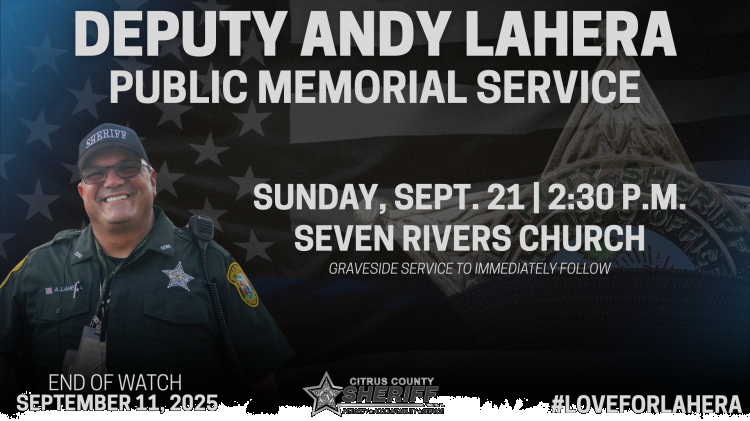 The Citrus County Sheriff's Office invites members of the community to attend a Memorial Service that will honor the life and service of Deputy Andy Lahera on Sunday, September 21, 2025.