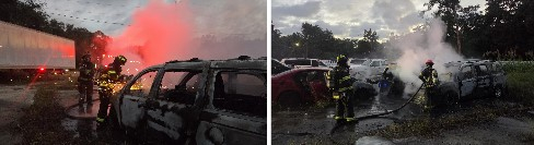 The Engine 14 crew from the Citrus Springs fire station arrived at the location at 7:07 p.m. to find several vehicles fully engulfed in flames at a small parking lot that contained several parked cars. Firefighters deployed hose lines and had water on the fire by 7:09 p.m. Firefighters prevented the blaze from spreading to nearby vehicles and property.